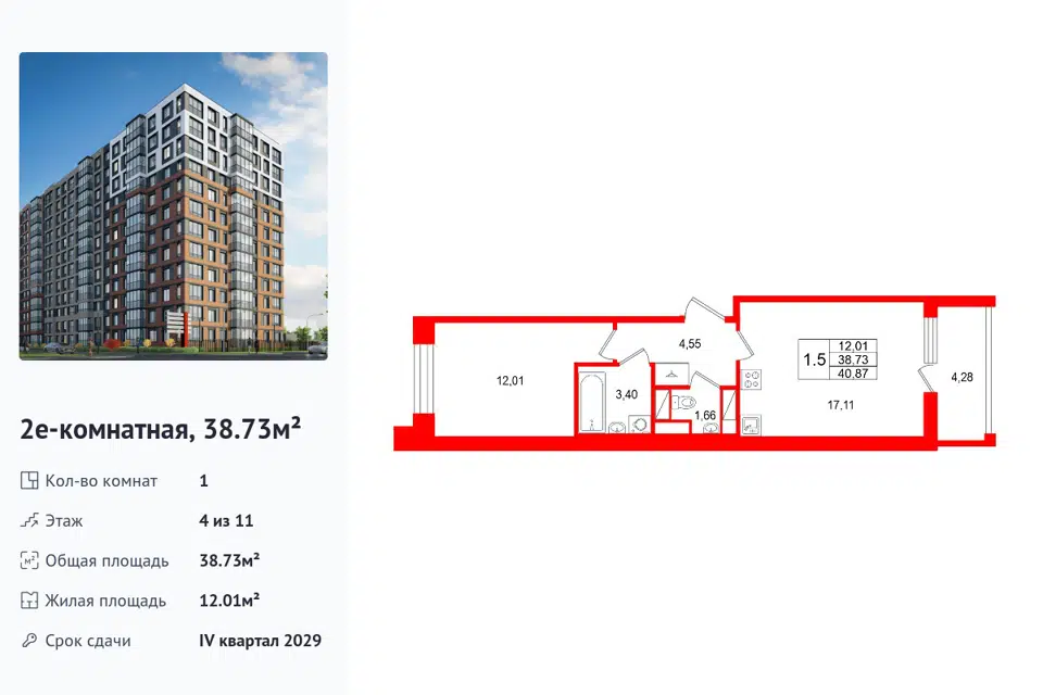 1-комн. кв., 38.73 м², 3/1 этаж