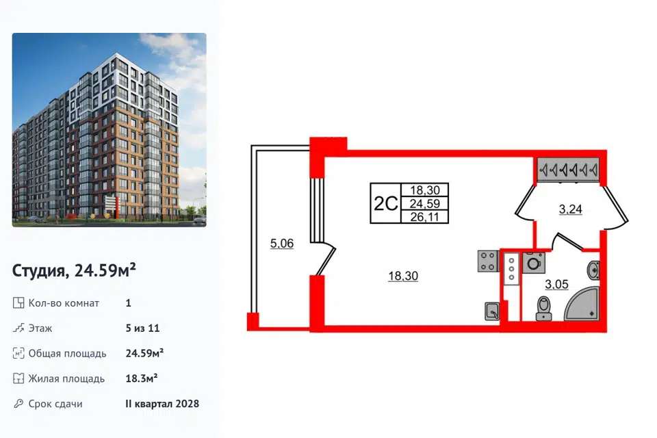 Студия, 24.59 м², 5/14 этаж