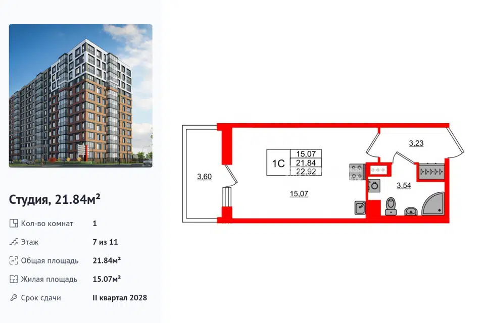 Студия, 21.84 м², 7/1 этаж