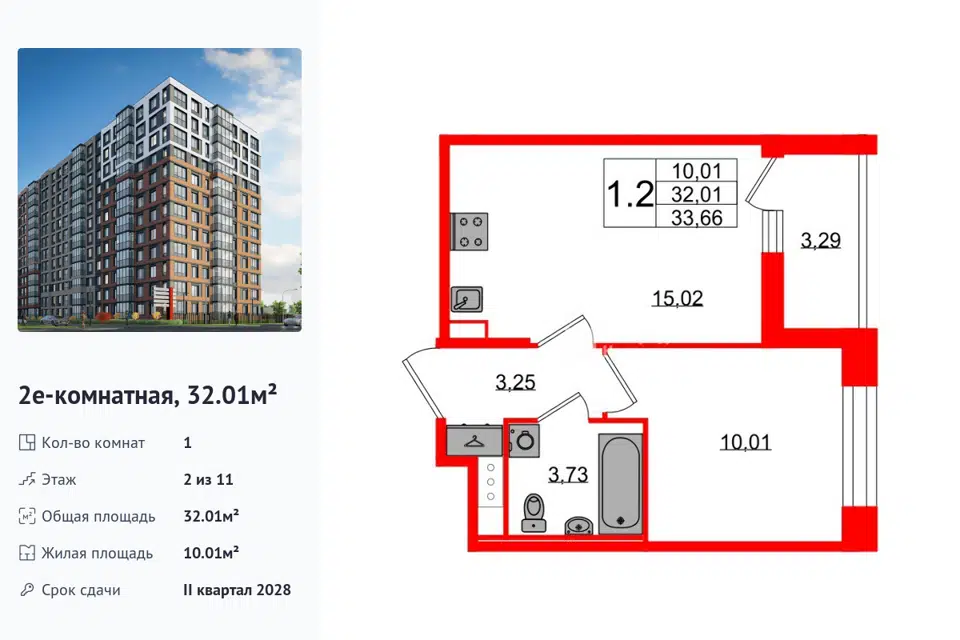 1-комн. кв., 32.01 м², 2/1 этаж