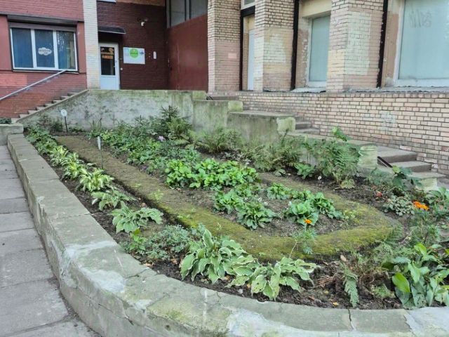 Вход в подъезд с улицы, окна выходят на тихий зеленый двор.