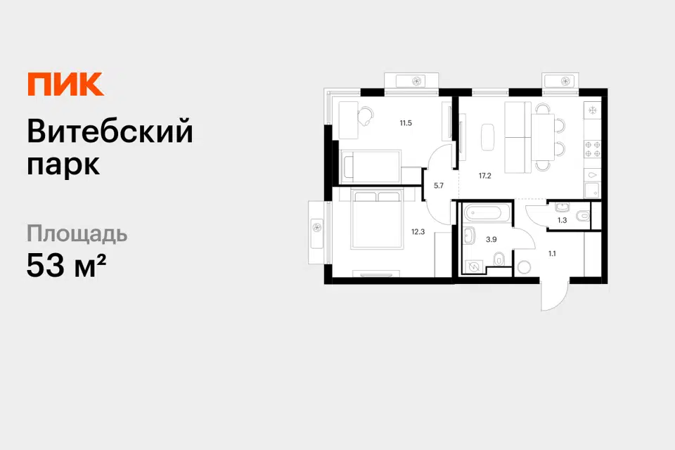 2-комн. кв., 53 м², 6/12 этаж