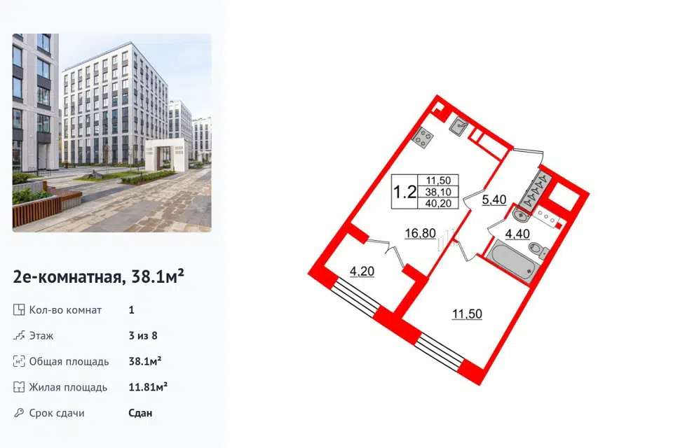 1-комн. кв., 38.1 м², 3/1 этаж