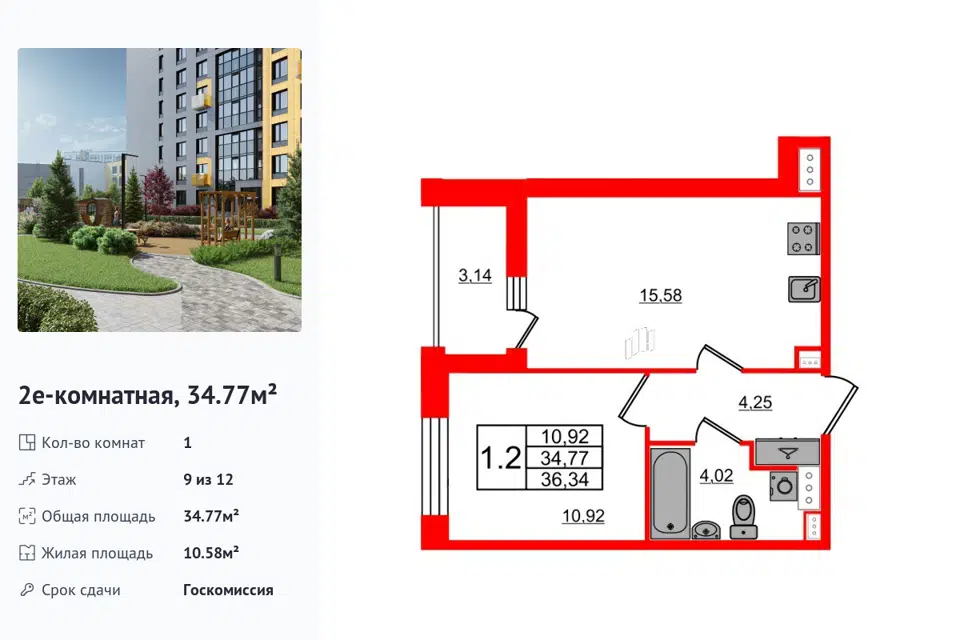 1-комн. кв., 34.77 м², 9/12 этаж