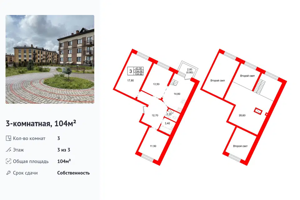 3-комн. кв., 104 м², 3/3 этаж