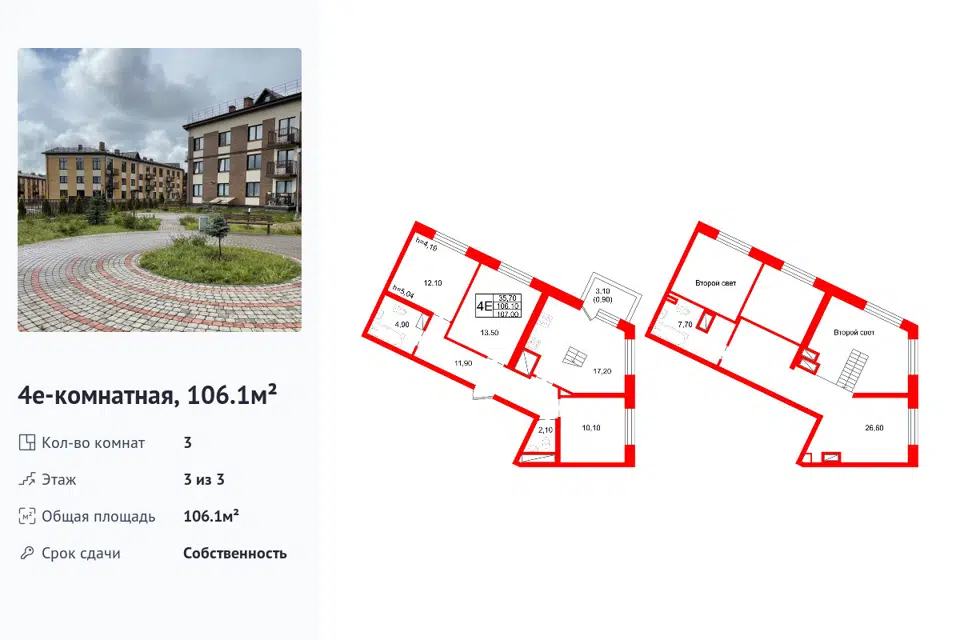 3-комн. кв., 106.1 м², 3/3 этаж