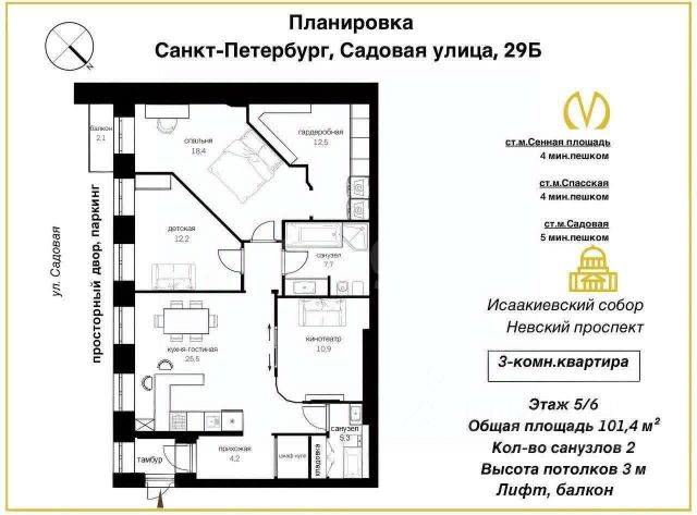 3-комн. кв., 101.4 м², 5/6 этаж