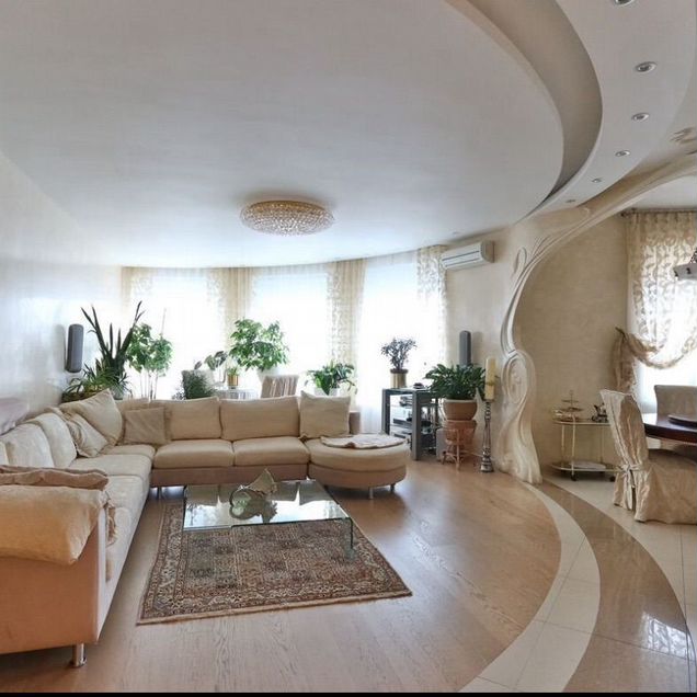 Здание внешне напоминает богатые городские усадьбы в классическом стиле с колоннами и террасами. В квартире можно разместить 4-5 просторные комнаты с персональными ванными и вместительными гардеробными комнатами, большую кухню-гостиную. Также есть площади для хозяйственных помещений и комнаты для персонала. В квартире есть собственный лифт.