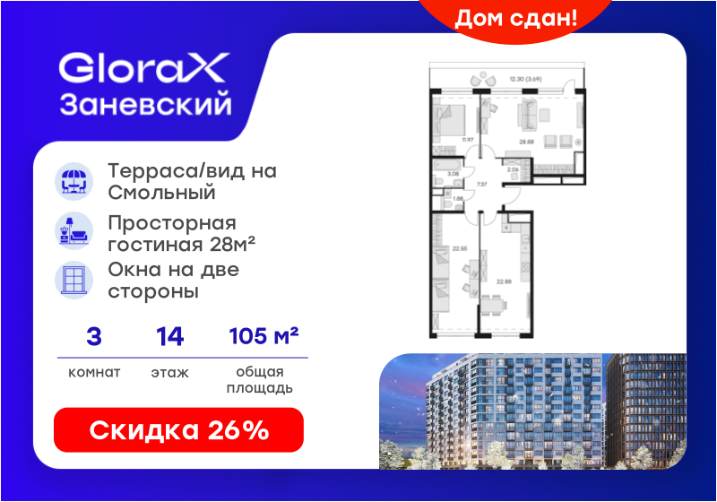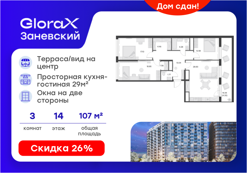 3-комн. кв., 107.8 м², 14/14 этаж