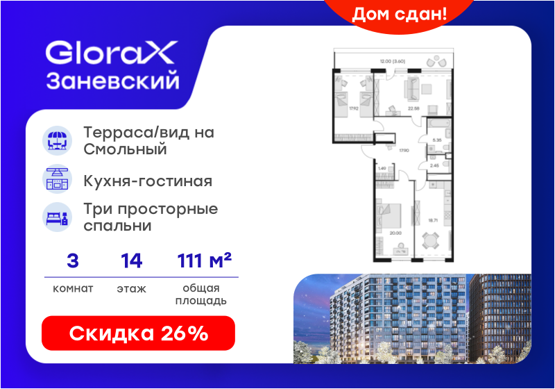 3-комн. кв., 111.2 м², 14/14 этаж