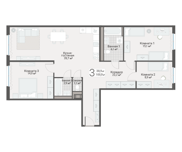 3-комн. кв., 100.9 м², 1/13 этаж