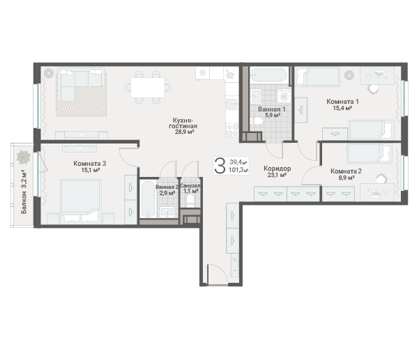 3-комн. кв., 101.1 м², 11/13 этаж