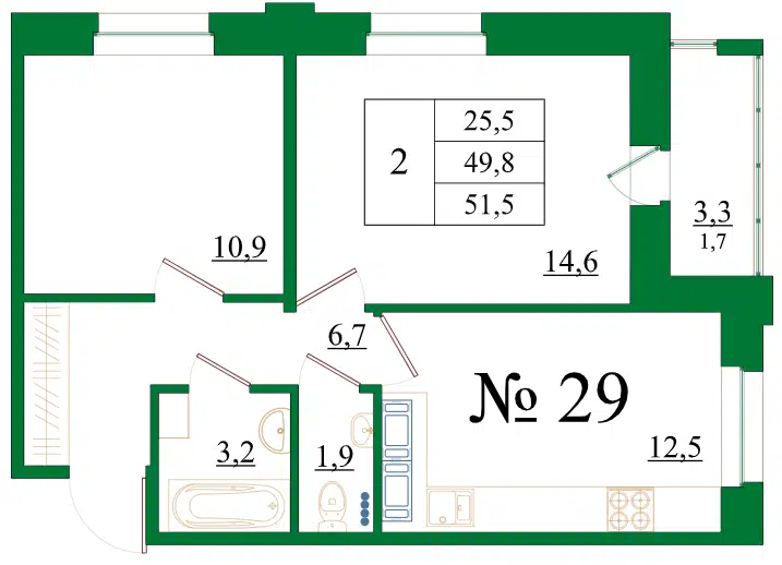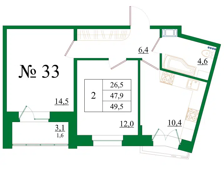 2-комн. кв., 49.5 м², 3/8 этаж
