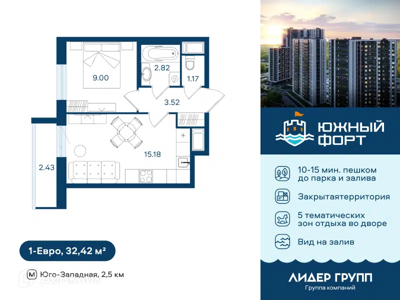 1-комн. кв., 32 м², 2/21 этаж
