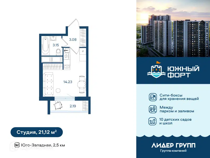 Студия, 22.5 м², 20/23 этаж