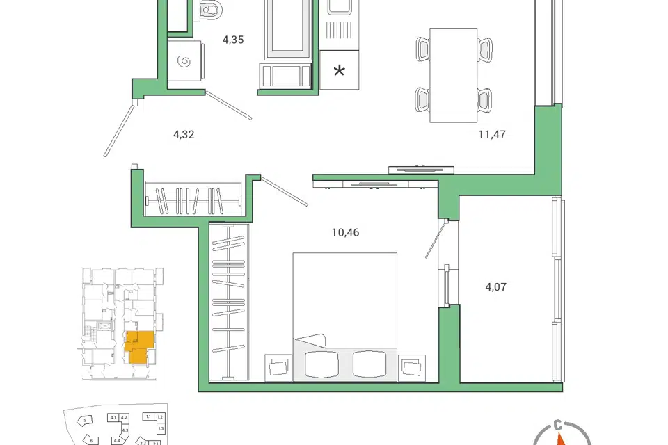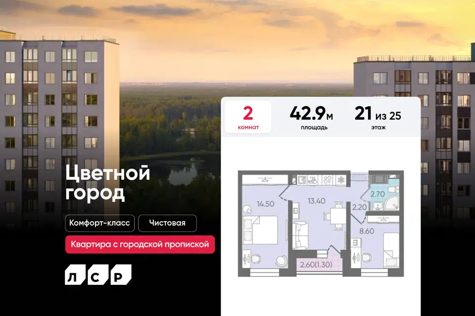 2-комн. кв., 42.9 м², 21/25 этаж