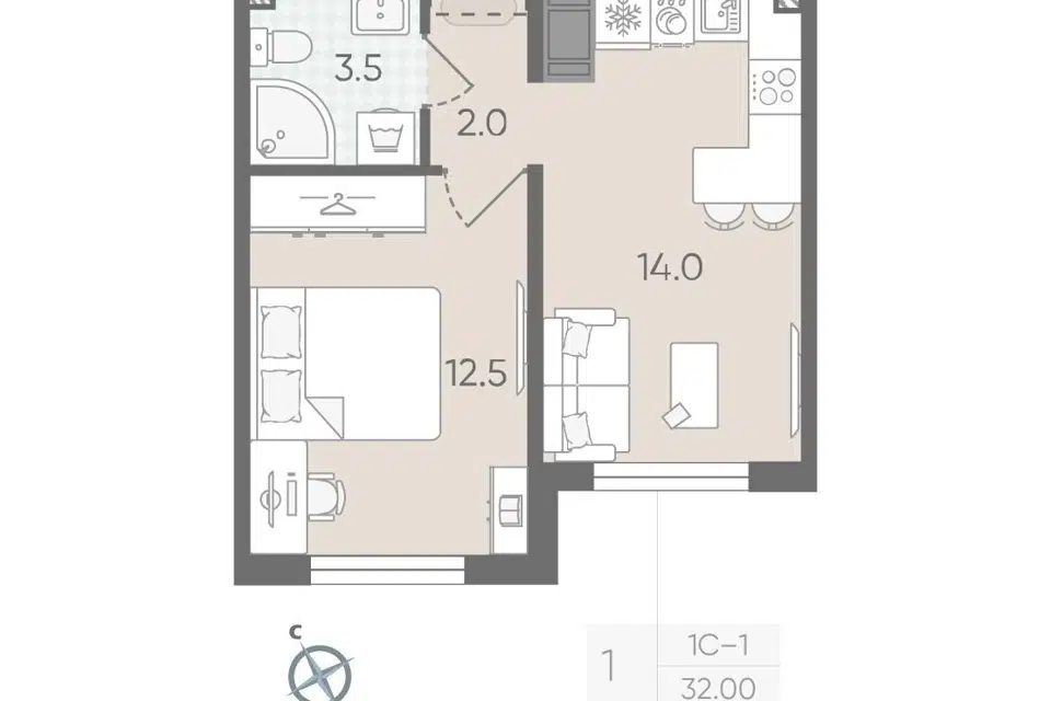 1-комн. кв., 32 м², 4/25 этаж