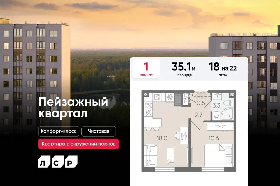 1-комн. кв., 35.1 м², 9/22 этаж