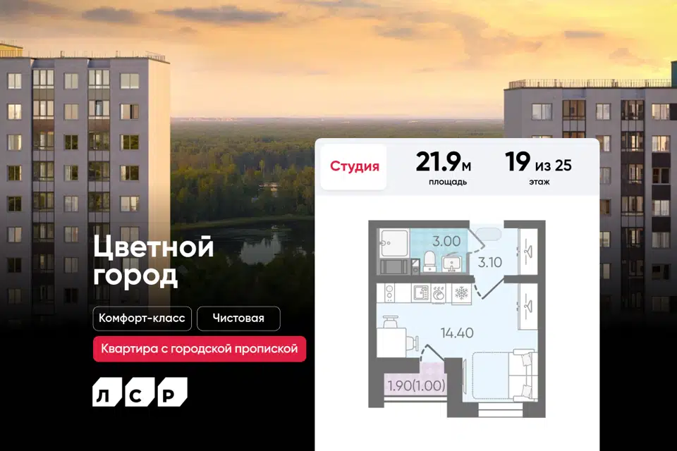 Студия, 21.9 м², 15/25 этаж