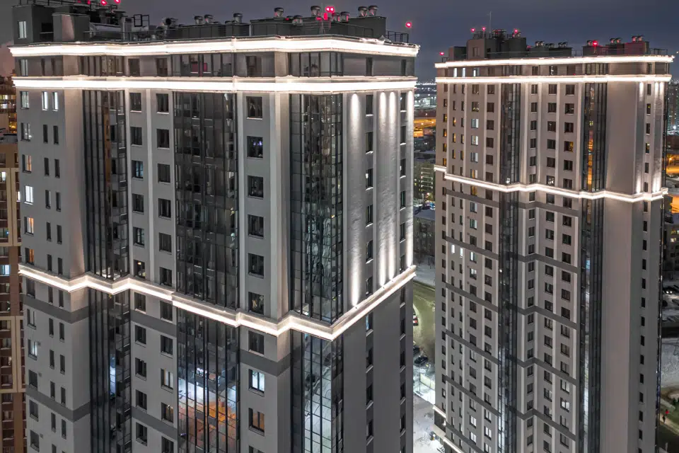 В фасаде жилого комплекса нашла отражение лаконичная cкандинавская цветовая гамма, а для того, чтобы дом выглядел эффектно вечером, используется светодиодная архитектурная подсветка от FOSSA ELECTRIC.