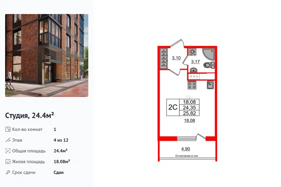 Студия, 24.4 м², 4/1 этаж