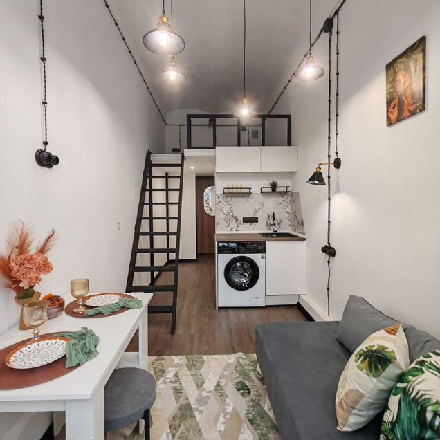 На первом этаже выделена кухонная зона, рабочее пространство и небольшой раскладной диван. Продуманы места для хранения. Второй этаж построен на металлокаркасе, подняться туда можно по лестнице. Там расположено спальное место, небольшой комод и сушилка для белья. В комнате натяжной потолок, высота 3.62м.
