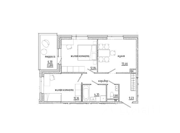 2-комн. кв., 45.8 м², 6/9 этаж
