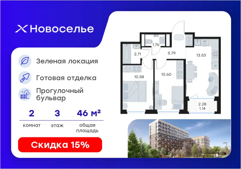 2-комн. кв., 46.11 м², 3/12 этаж