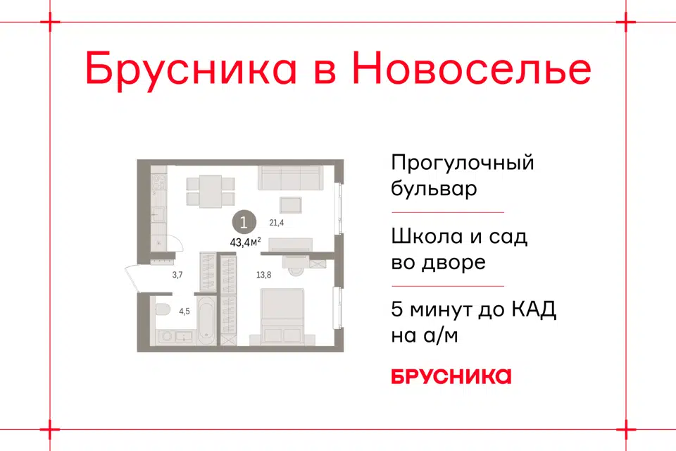 1-комн. кв., 43.35 м², 4/9 этаж