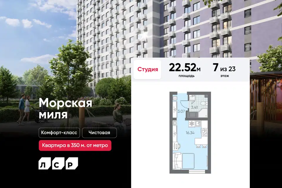 Студия, 22.52 м², 7/23 этаж