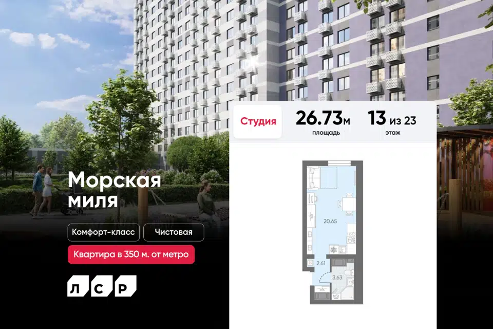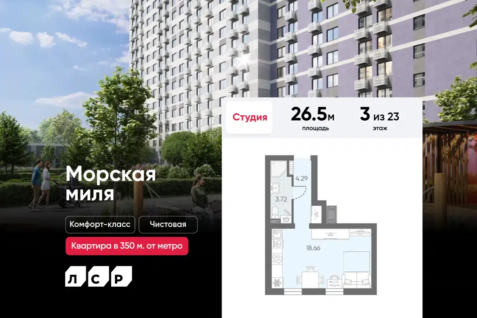 Студия, 26.5 м², 3/23 этаж
