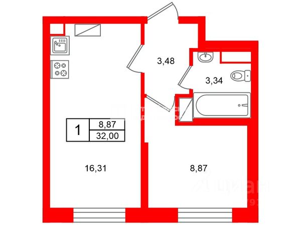 1-комн. кв., 32.9 м², 8/13 этаж
