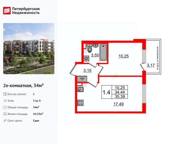 1-комн. кв., 34.45 м², 3/1 этаж