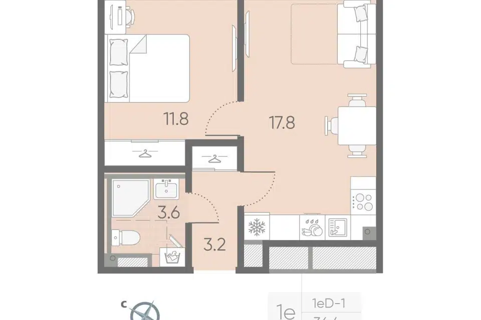 1-комн. кв., 34.1 м², 2/4 этаж