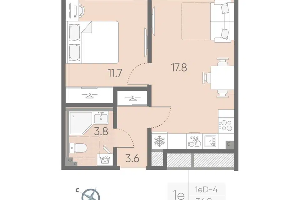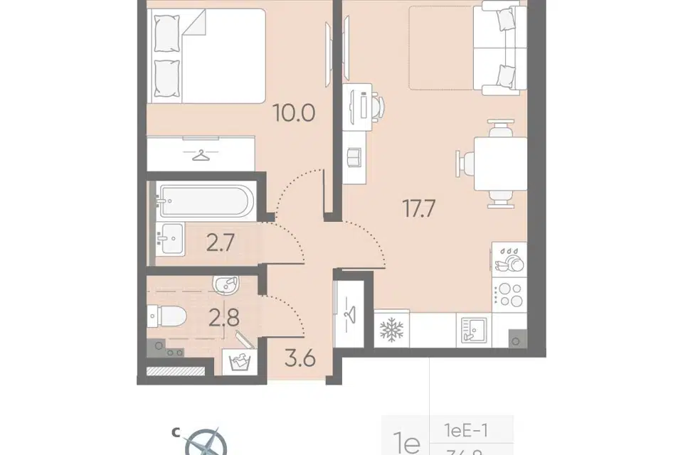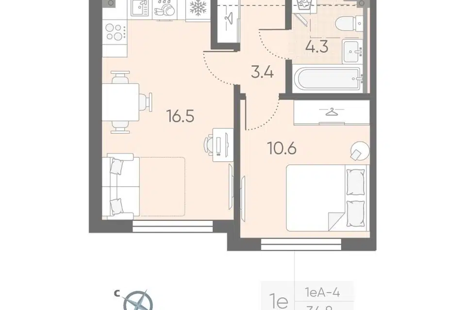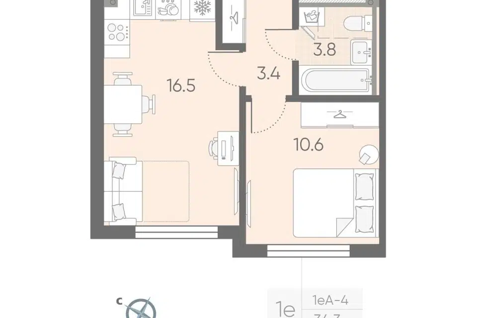 1-комн. кв., 34.8 м², 3/4 этаж
