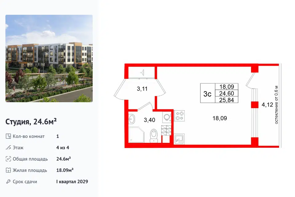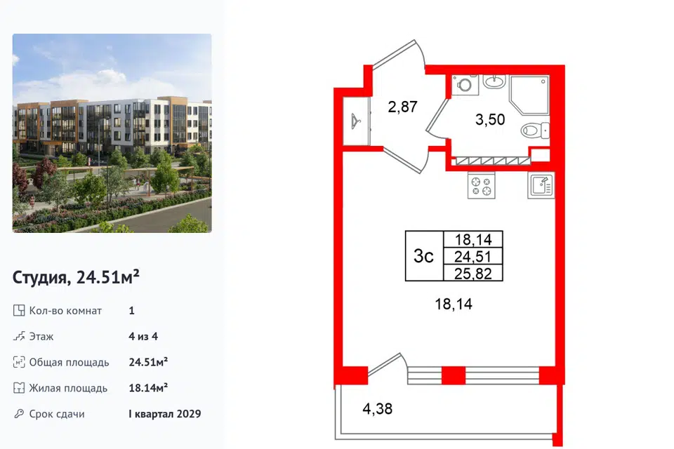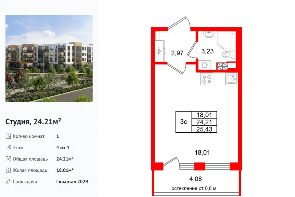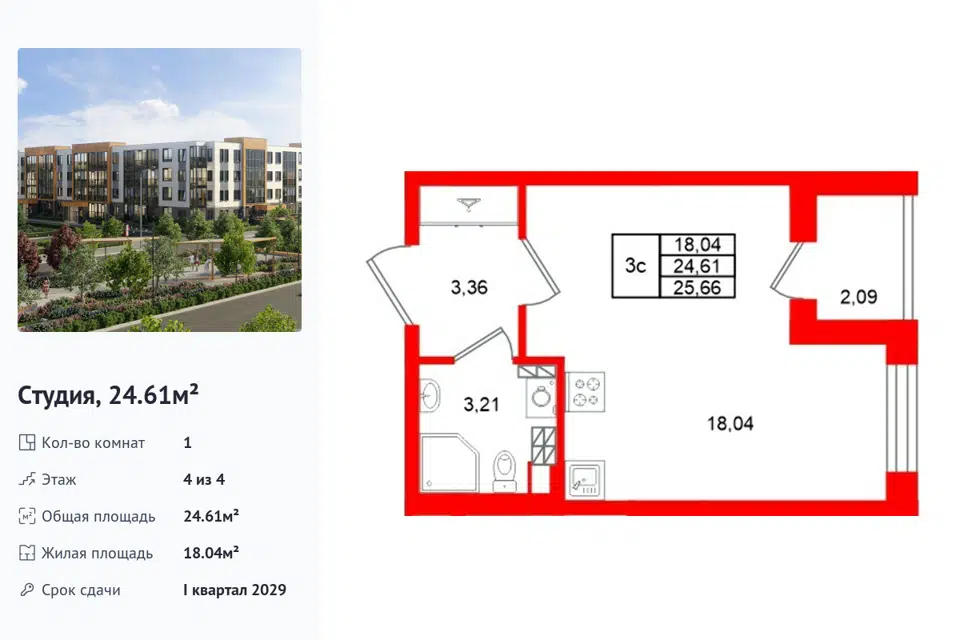 Студия, 24.21 м², 4/1 этаж