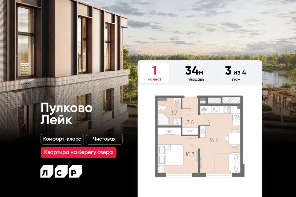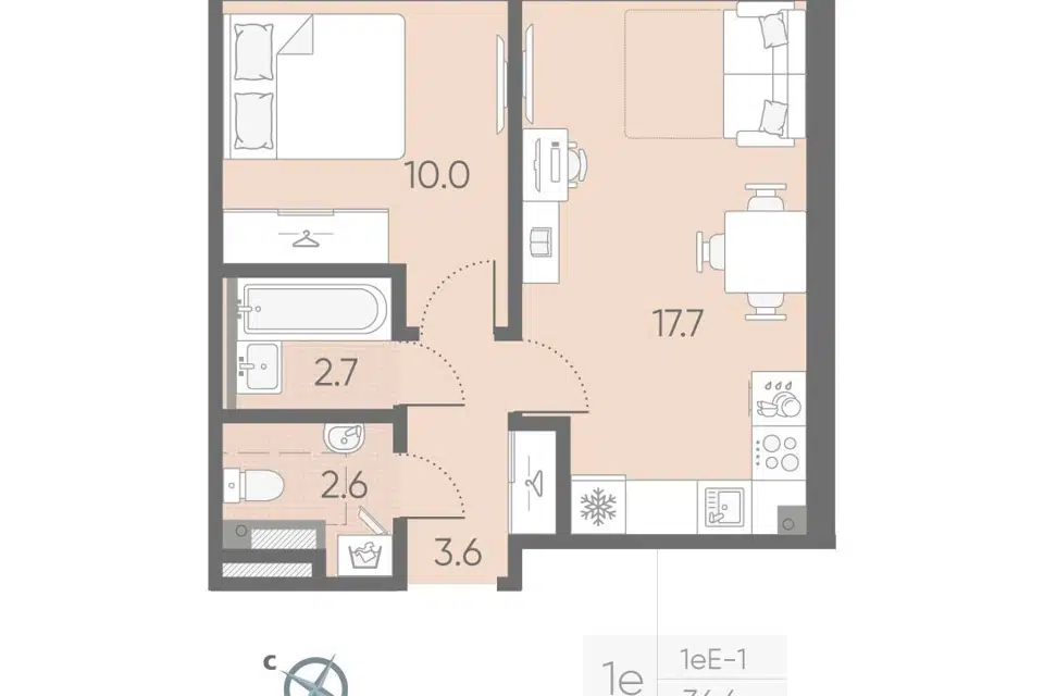 1-комн. кв., 34.4 м², 3/4 этаж