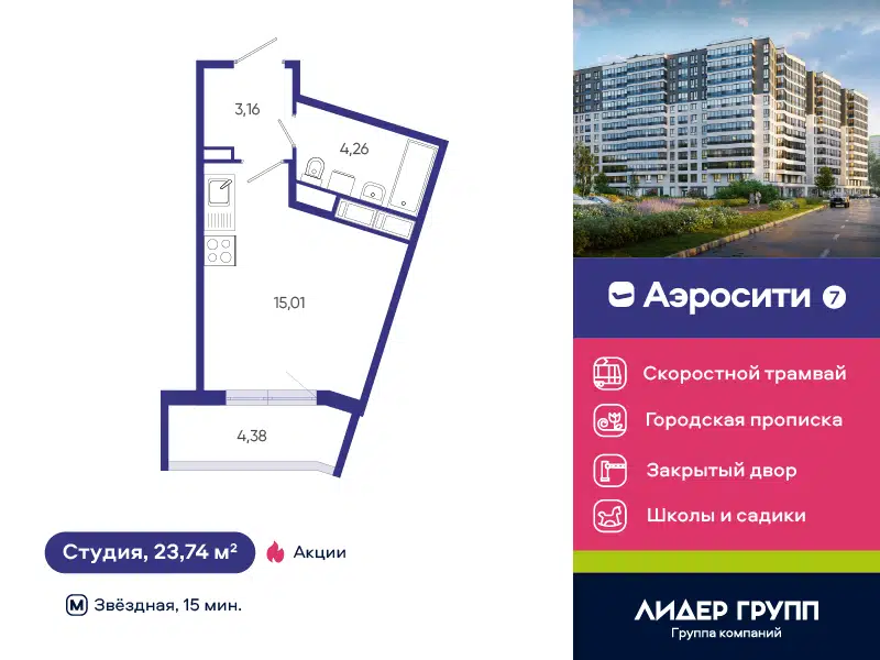 Студия, 23.74 м², 12/12 этаж