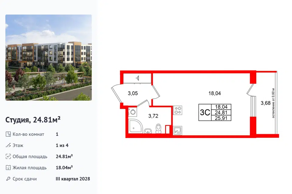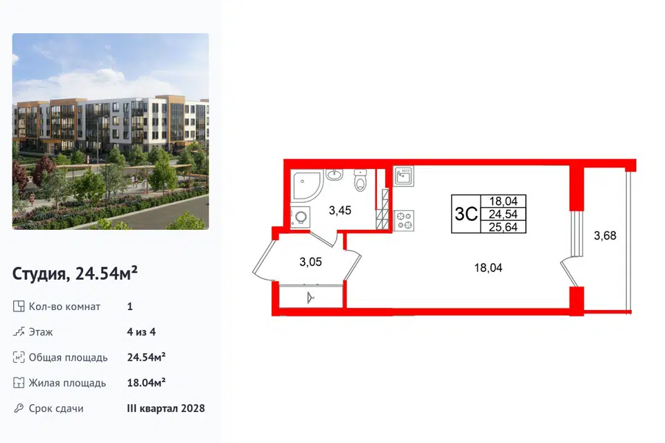 Студия, 24.54 м², 4/1 этаж