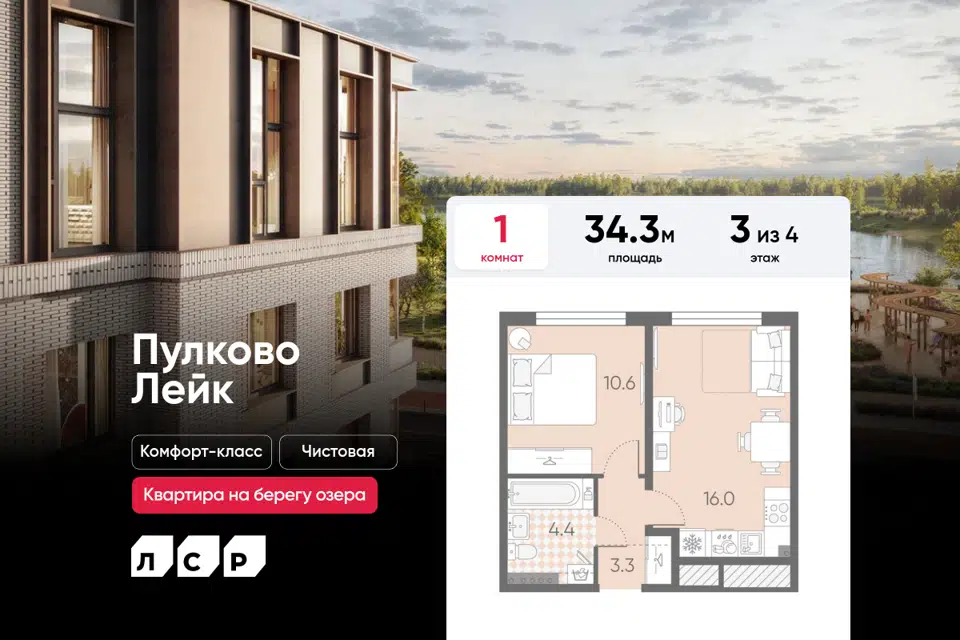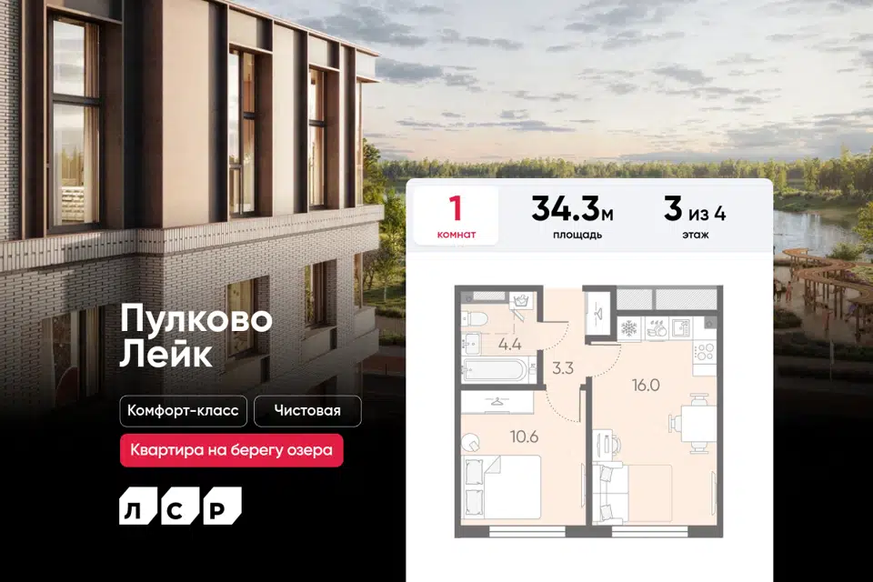 1-комн. кв., 34.3 м², 3/4 этаж