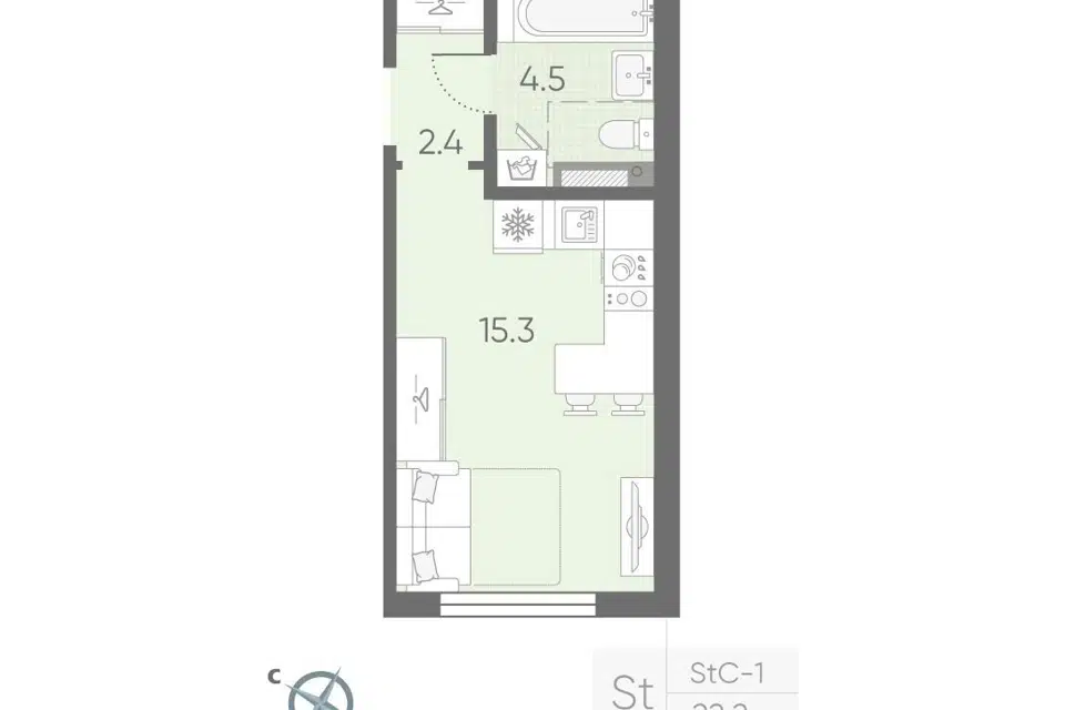 Студия, 22.5 м², 2/4 этаж