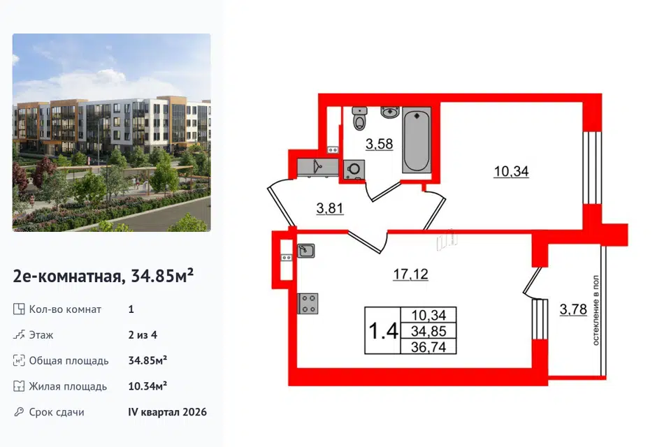 1-комн. кв., 34.85 м², 2/1 этаж