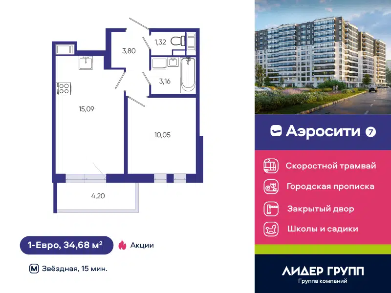 1-комн. кв., 34.68 м², 12/12 этаж