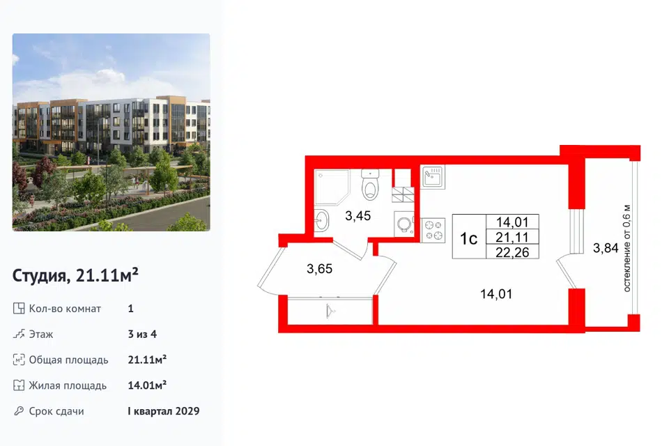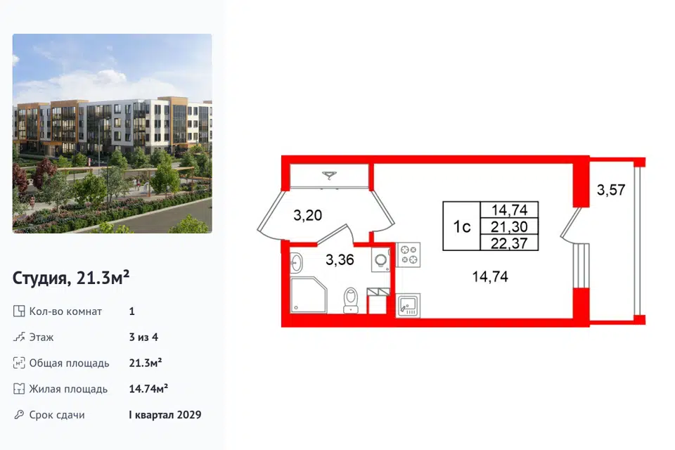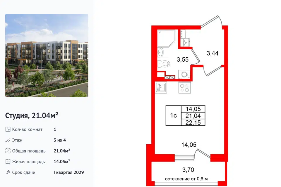Студия, 21.04 м², 3/1 этаж
