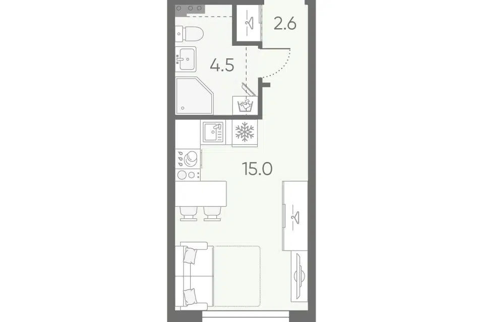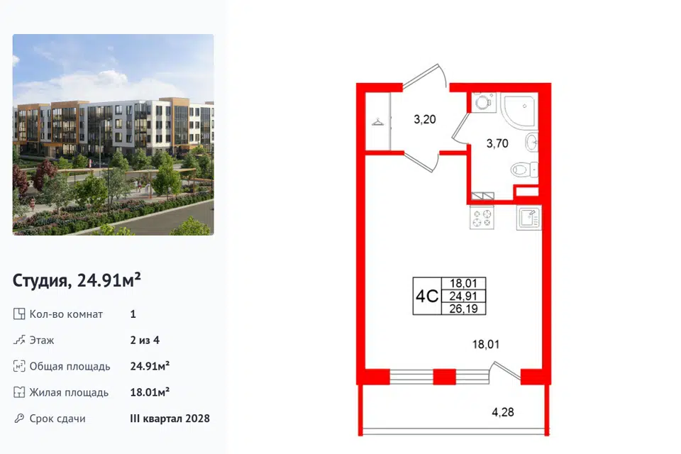 Студия, 25.7 м², 2/4 этаж