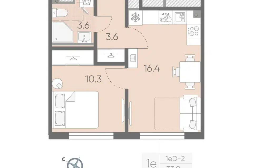 1-комн. кв., 33.1 м², 2/12 этаж