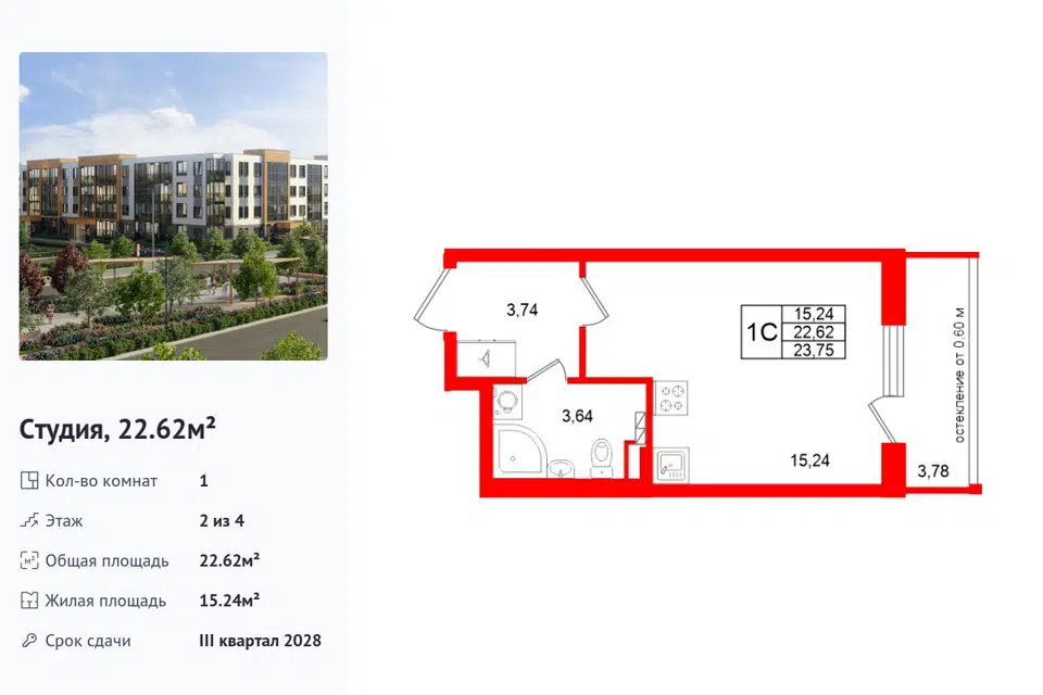 Студия, 23.6 м², 2/4 этаж