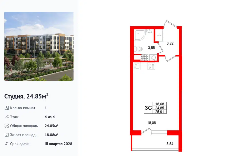 Студия, 24.85 м², 4/1 этаж