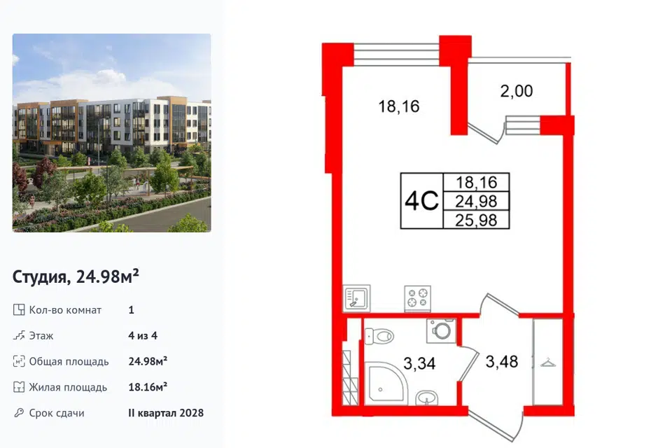 Студия, 24.98 м², 4/1 этаж