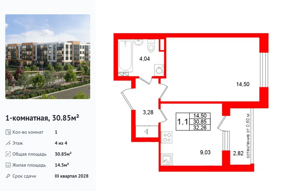 1-комн. кв., 30.85 м², 4/1 этаж